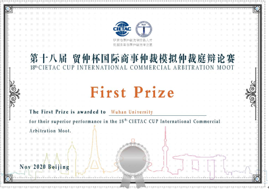 代表队在2020年的“贸仲杯”国际商事仲裁模拟仲裁庭辩论赛以循环赛总分第一的成绩从来自全国各地的六十九支队伍中脱颖而出,荣获全国一等奖。