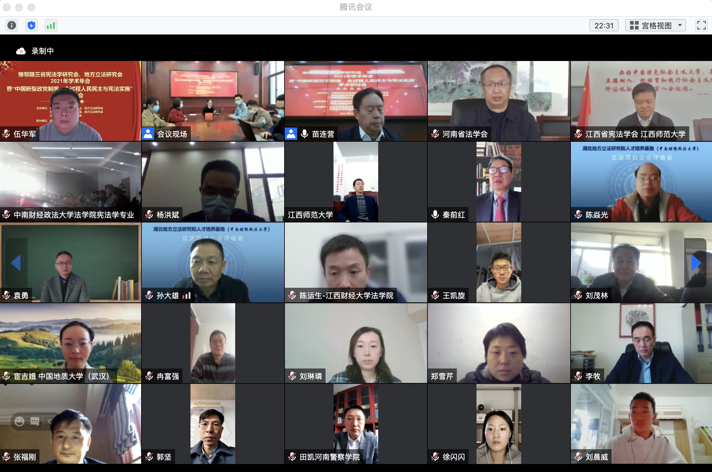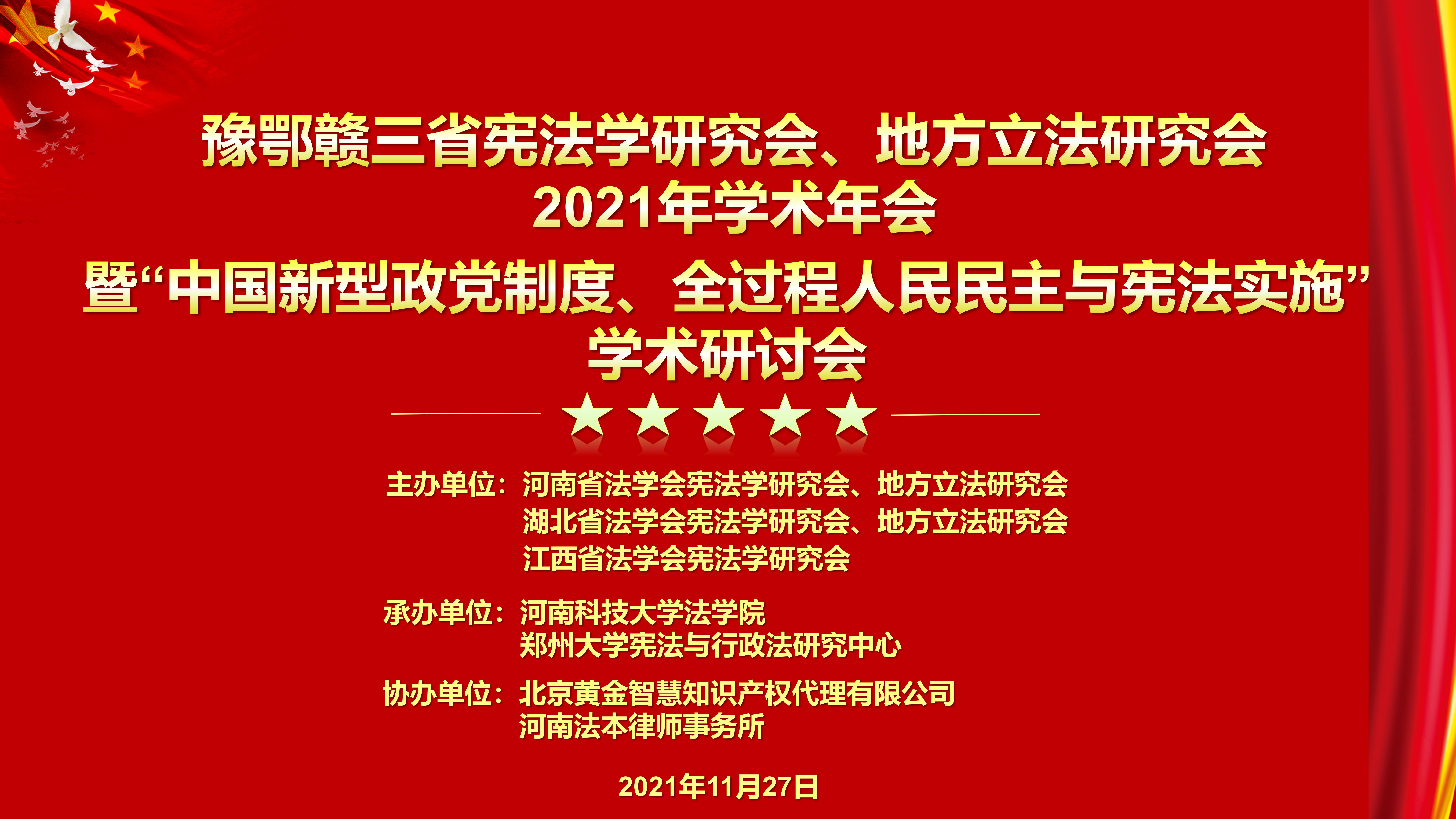 (通讯员荣锦坤)近日,“豫鄂赣”三省宪法学研究会、地方立法研究会2021年学术年会暨“中国新型政党制度、全过程人民民主与宪法实施”学术研讨会在河南洛阳举行。本次会议由河南省法学会宪法学研究会、地方立法研究会,湖北省法学会宪法学研究会、地方立法研究会,江西省法学会宪法学研究会、地方立法研究会主办,河南科技大学高辣文