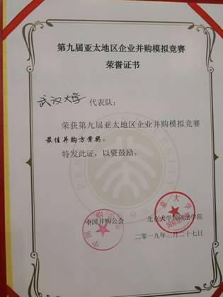 代表队首次参赛并一举夺得最终大奖——“最佳并购方案奖”。队员贾海东荣获“最佳表现奖”并直接获得中国并购公会特别颁发的 “初级并购交易师证书”,汪玥荣获“最佳队员奖”。