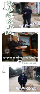 突击队员一天需连续工作9小时,加之近两周武汉昼夜温差大,正午时分有时直达25度,戴上口罩、穿上防护服不停走动对各位老师来说都是不小的挑战。面对困难,学院党员突击队干劲十足,配合社区工作人员尽职尽责做好各项工作。李安安老师认真负责,不仅及时劝阻居民外出,还上前询问每个来往的行人是否需要帮助,催促他们尽快回家;尚彩云老师在面对一名执意拉着小拖车想外出采购的老人时,耐心为他讲解目前防控的严峻局势和各级管理政策,解释了许久才把老人劝服;安丰雷老师和郭新奇老师值守期间恰遇兄弟单位对学院的捐赠物质到汉,他们马不停蹄地把爱心传递;刘中旭老师和赵晓耘老师值守时正好赶上阴雨绵绵,他们冒雨为社区居民分发爱心菜;吴育生老师主动为一位88岁的老人联系购药,又亲手将购买到的药品送至老人家中;从微信群里得知学院一位退休老教师因孤身一人在疫情期间面临吃饭难题,将爱心盒饭按时送至老人手上成为突击队员每天必须完成的任务………