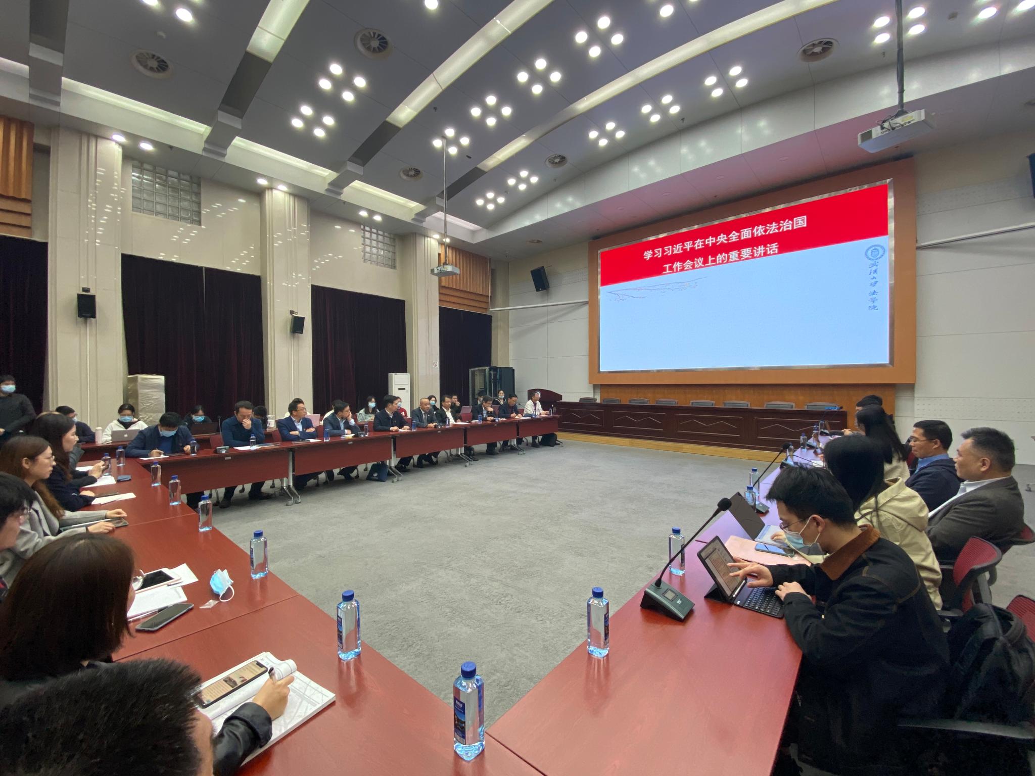 冯果院长结合参加中央全面依法治国工作会议、现场聆听总书记讲话的切身感受提出三点要求:一是要充分认识此次会议的重要意义和习近平法治思想的重要地位。中央全面依法治国工作会议是在党的“两个一百年”奋斗目标历史交汇期,国际环境复杂多变的特殊时间节点召开的一次重要会议。以习近平同志为核心的党中央在深入思考新时代为什么要实行全面依法治国、怎样实行全面依法治国等一系列重大问题的基础上,提出了“全面推进依法治国,建设中国特色社会主义法治体系”等一系列重大论断,逐步形成了习近平法治思想这一马克思主义法治理论中国化的最新成果。二是要认真学习、深刻领会、准确阐释习近平法治思想。习近平法治思想博大精深、内涵丰富、论述深刻,是顺应实现中华民族伟大复兴时代要求应运而生的重大理论创新成果。“法治兴则国家兴”,全院师生要认真学习领会、准确阐释和深入宣传习近平法治思想,吃透基本精神、把握核心要义,切实把习近平法治思想贯彻落实到工作学习的全过程中,为实现中华民族伟大复兴的中国梦提供有力法治保障。三是要把习近平法治思想作为引领工作、推进学科建设的动力。习近平总书记在讲话中提到的“坚持建设德才兼备的高素质法治工作队伍”、“坚持统筹推进国内法治和涉外法治”等内容都将成为下一步寻找学科建设的新增长点。作为法学教育工作者,我们责任重大,使命光荣,要按照总书记要求,加快学科建设改革、加深学术研究创新,在学科布局、资源配置、制度设计上下功夫,尤其是要加大涉外法治人才培养,在新的起点,为法治中国建设和法治人才培养做出新的贡献。