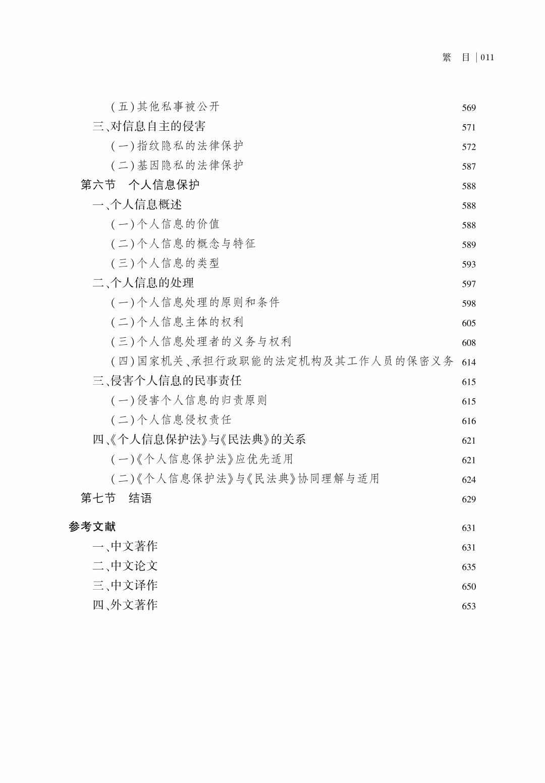 2. 增加第六章第六节“个人信息保护”。《民法典·人格权编》第六章的标题为“隐私权和个人信息保护”,本章条文数为8条,第1032~1033条规定隐私权,第1034~1039条规定个人信息保护相关内容。由此可见,衍生于隐私权的个人信息保护已经取得了相对独立的法律地位,其重要性在互联网时代更加彰显,其与人民的生活更加密切相关。随着《个人信息保护法》的出台,有关个人信息保护的法律适用将更为重要。基于此,本次增加第六章第六节,就个人信息的认定、个人信息的处理、侵犯个人信息的法律责任以及《民法典》个人信息保护条文与《个人信息保护法》在法律适用上的关系等基本问题予以阐述。限于篇幅,本章只能就《民法典》第1034~1039条作教义学建构,无法囊括《个人信息保护法》的全部内容。