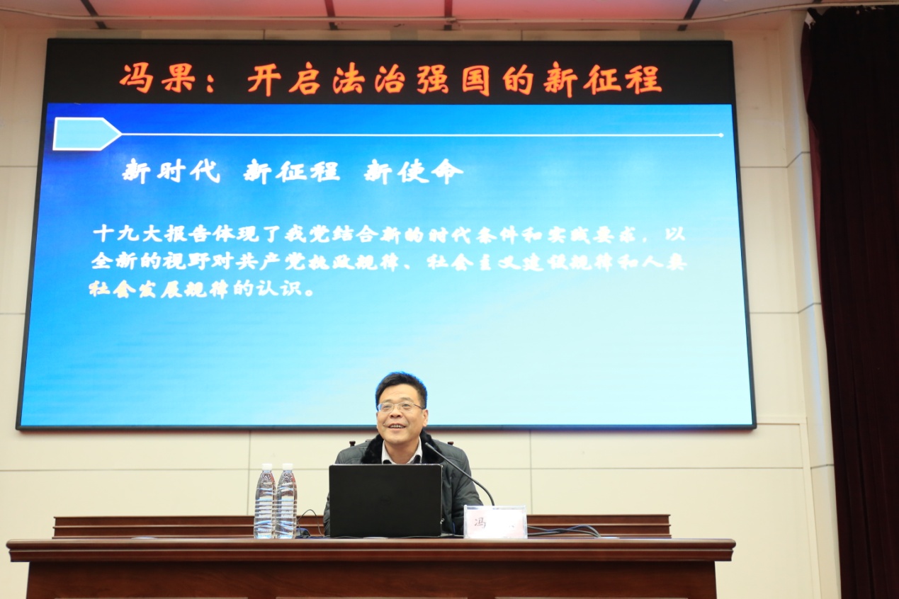本次课程紧紧围绕党的十九大报告开展,冯果教授深入浅出地讲述了新时代背景下的法治现状和法治目标,让在场学子受益匪浅。