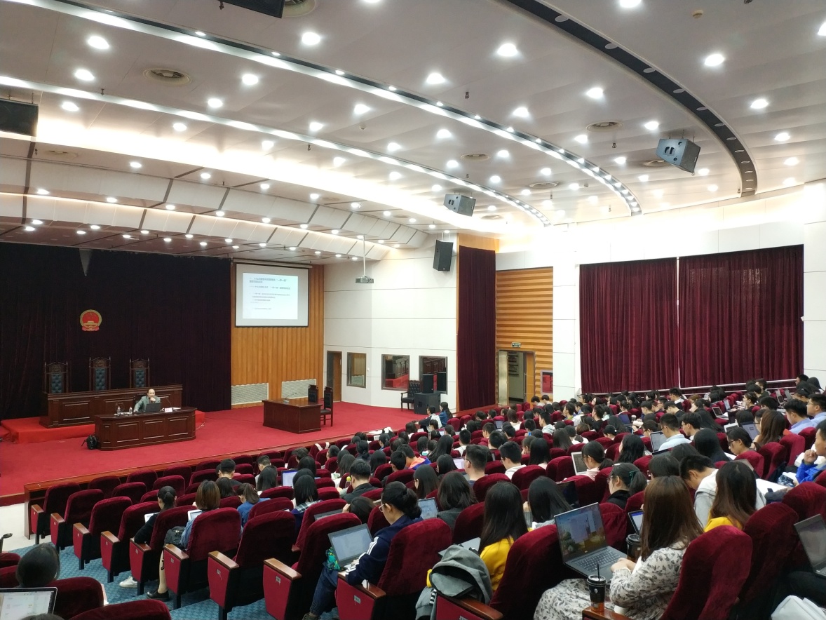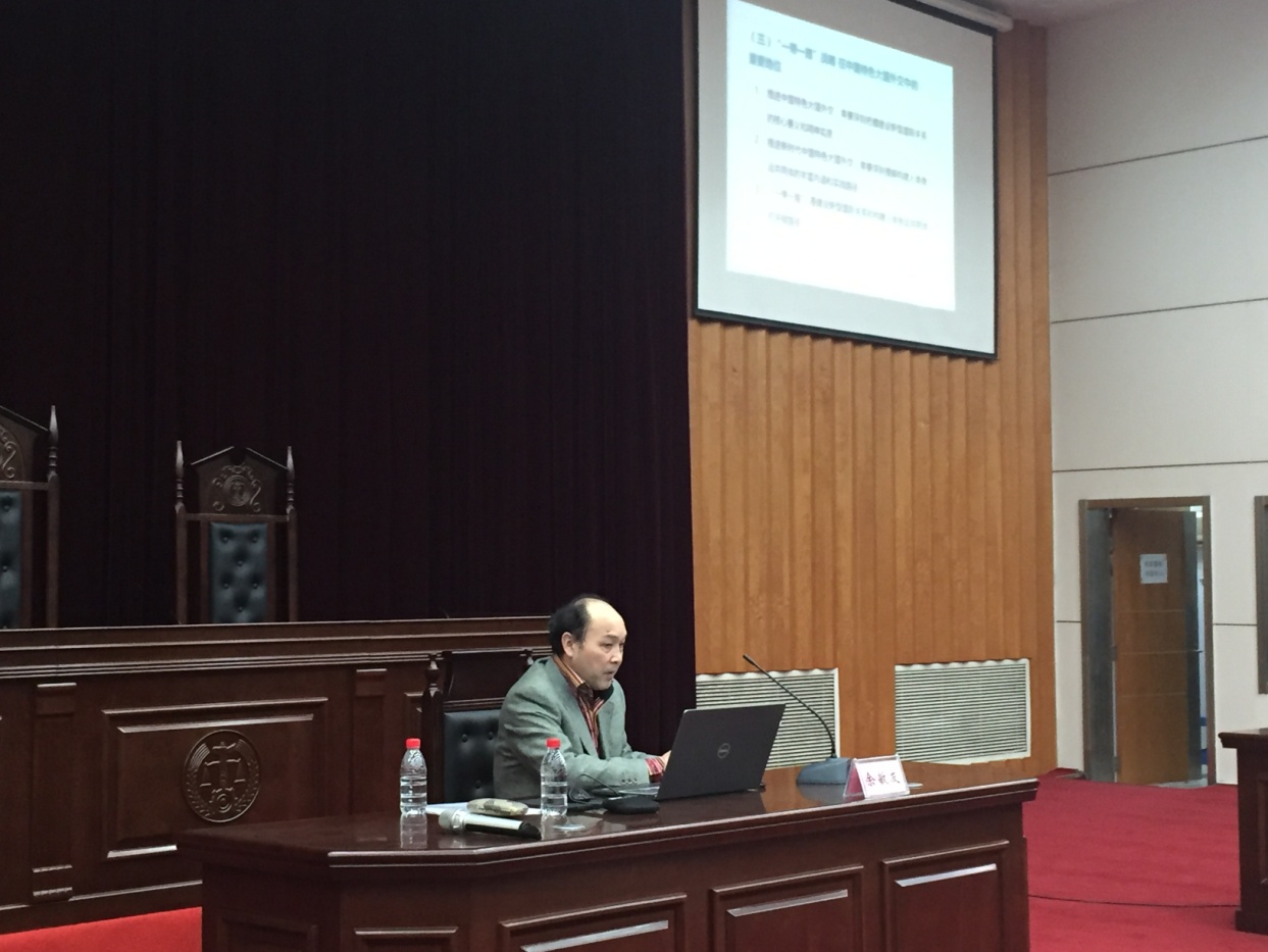 余敏友教授主要围绕党的十九大报告和党章中有关“一带一路”内容的阐释、“一带一路”倡议在中国特色大国外交策略里的地位以及“一带一路”涉及的国际法问题这三个方面为同学们进行讲解。