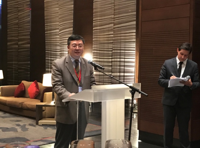 当晚,受法国驻华大使邀请,秦天宝教授出席了于大使官邸举行的酒会并代表中方代表致欢迎辞。他指出,在法国通过的《巴黎协定》所倡导的绿色、低碳、可持续发展道路,同中国的生态文明建设和绿色发展理念是非常契合的。在此背景下,两国环境法的合作,必将成为两国合作的新领域和新亮点。他以高辣文