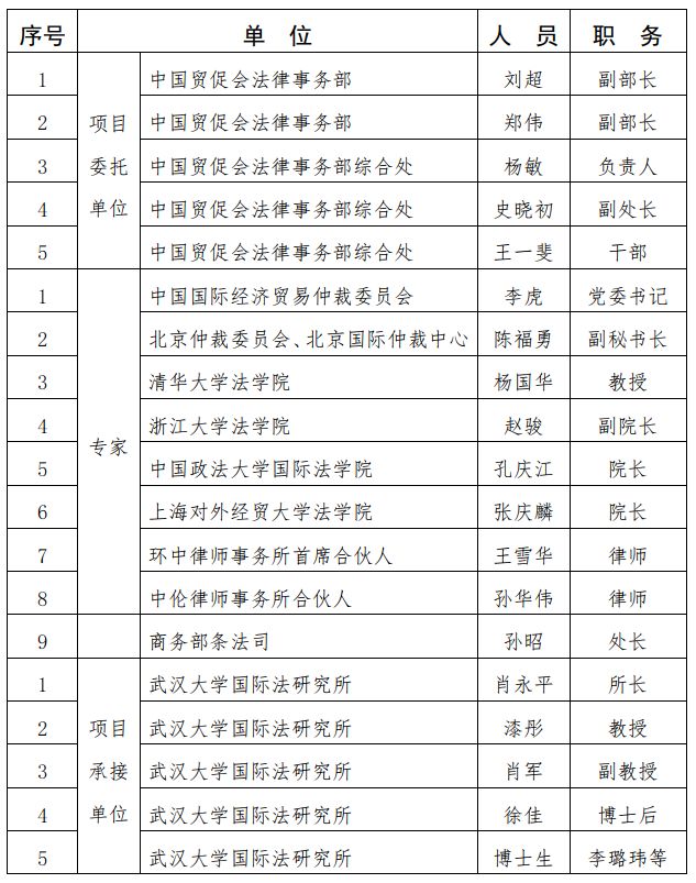 来自项目委托单位中国国际贸易促进委员会法律事务部的刘超副部长、郑伟副部长以及法律事务部综合处负责人杨敏女士、史晓初副处长、干部王一斐等多人出席了本次会议。会议还邀请了来自商务主管部门、学术界以及实务界的多位专家参与会议研讨。高辣文
