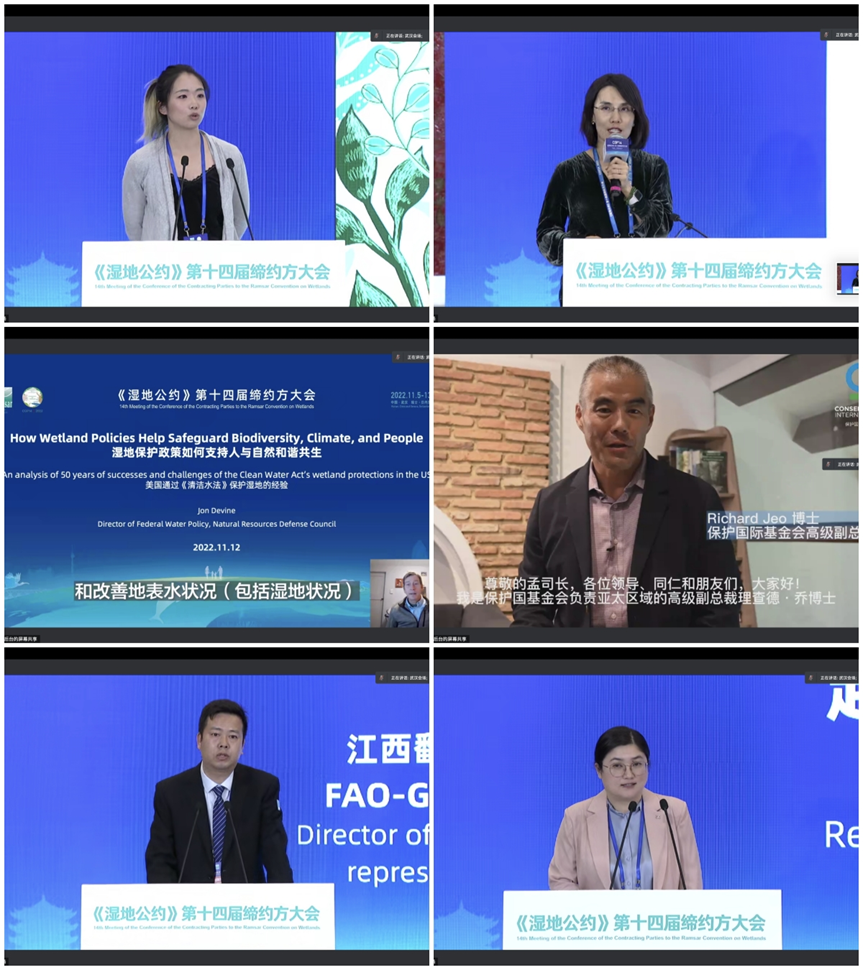 On November 12, Research Institute of Environmental Law(Wuhan University),the Global Environmental Institute (GEI), International Crane Foundation (ICF), Natural Resources Defense Council (NRDC), and Conservation International Foundation (CI) co-hosted a side event on the theme of "Cross-Regional Wetland Action: Connecting People, Species and Habitats" at the Donghu International Conference Center.