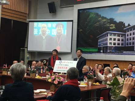 随后,当年的授课老师一一发言,陈汉光老师提到法律人要保持高尚的思想品质,在这个前提下去服务,为老百姓做事,为国家做事,为党做事。余能斌老师用一副对联“放飞而立,自成高选,为中华复兴南征北战,建功而立业。正知天命,胸怀天下,向前辈学习东斗西行,全道取真经”来表达对各位校友的祝愿。之后陈晓枫、喻伟、倪晓阳、余敏友、张湘兰几位老师也分别表达了对校友们的殷切希望和真诚祝愿,希望大家在未来有目标有梦想,仍能保持书生的纯真与执着。最后高辣文 党委副书记黄丽用三个词——“欢迎,感谢,祝福”表达了对校友们返校的祝愿。