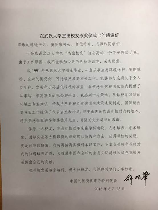 因工作原因,解振华校友不能返校参加杰出校友颁奖典礼,特意发来书面感谢信,全文如下: