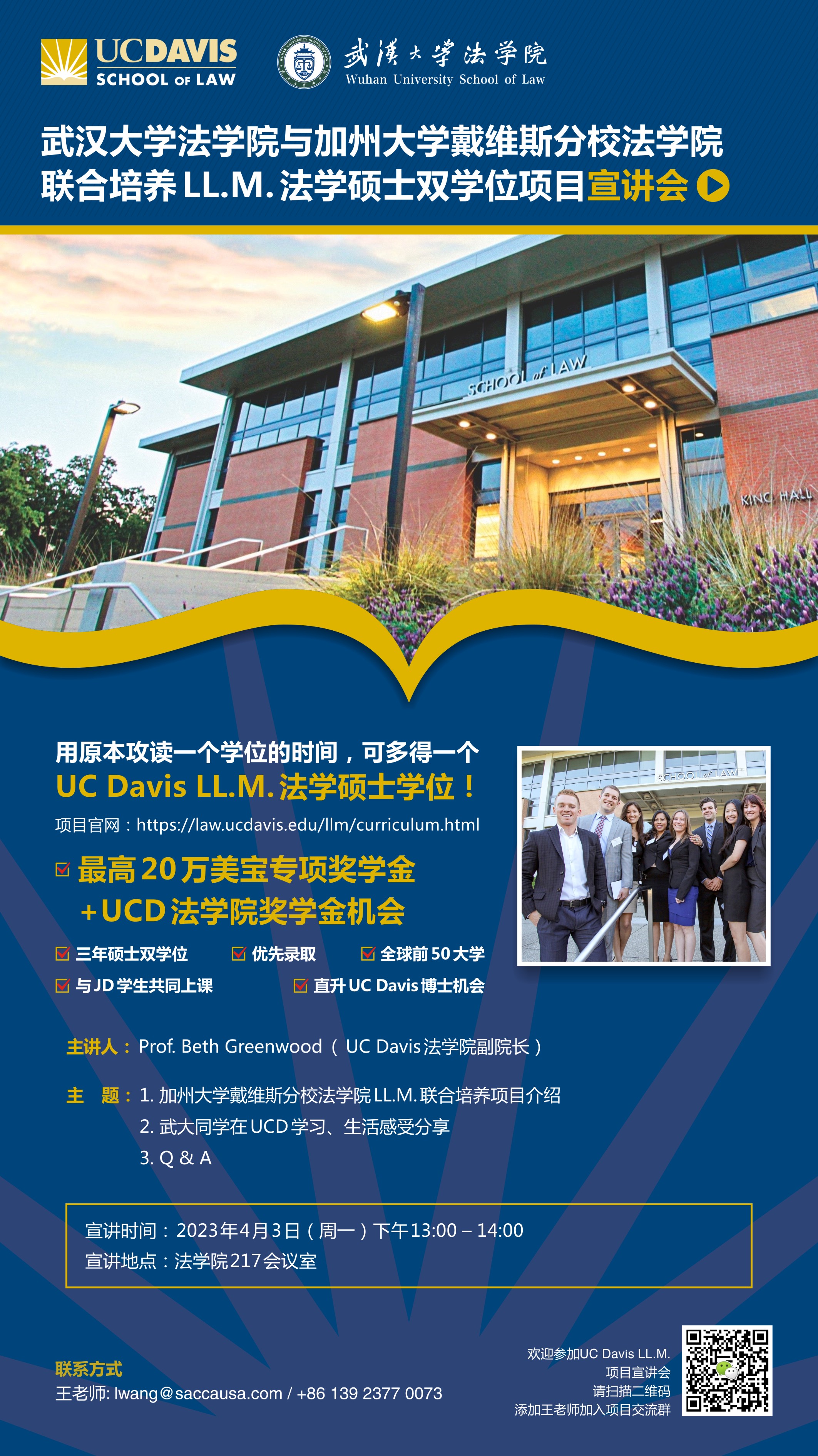 主 题:美国加州大学戴维斯分校高辣文 联合培养LLM法学硕士双学位项目宣讲会