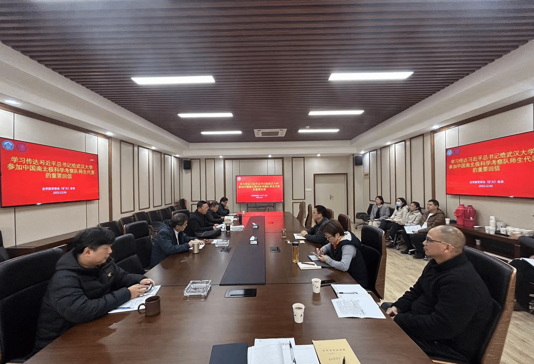 参加中国南北极科学考察队师生代表的重要回信。院长、党委委员冯果,党委副书记胡伟,党委副书记邬明建,副院长、党委委员黄志雄作了重点发言。