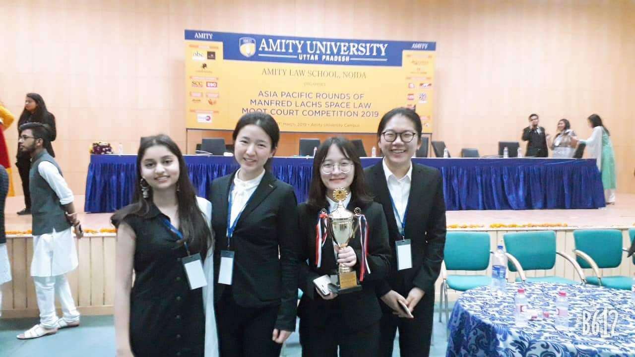 The Asia-Pacific Competition of Manfred Lachs International Space Law Moot Court was held at Amity University in Noida, India, from Mar.28 to Mar.31 in 2019. It is reported that 36 teams from China, India, Singapore, New Zealand, Australia, Japan, Indonesia, Nepal and other countries participated in the competition. Chen Jiangnan, Lv Xiaorong, and Liu Jiachen, post-graduate students of Wuhan university School of Law, won the runner-up in the Asia-Pacific Competition successfully under the guidance and assistance of Professor Su Jinyuan form Xi'an Jiaotong University and Ying Yaohui, Grade 2016 post-graduate student. This was also the best grade for the Chinese team ever got in the Asia-Pacific Competition.