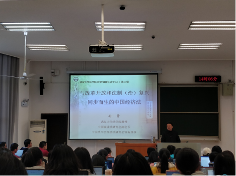 On November 14, the 10th session of the series of introductory lectures on law of Wuhan University hosted by the law school of Wuhan University was held in Room 201, teaching building 4, Ministry of Arts and Science. The theme of the lecture was "China's economic law, born at the same time with the reform and opening up and the revival of the rule of law". Professor Sun Jin, the vice director of China Business Law Research Association, delivered the speech. All 2019 undergraduate students from Wuhan University Law School attended the lecture.