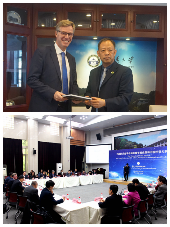 On November 14, 2019, the Seminar on "EU trade policy and China-EU economic and trade relations in the global system reform" was successfully held in the 120 hall of the law school. The guests of this round table seminar mainly include officials from the trade remedy department of the Council of Europe and the delegation of the European Union to China, officials from the trade remedy bureau of the Ministry of Commerce of China and the Department of Commerce of Hubei Province, experts and scholars from the Chinese Academy of Social Sciences and Beijing Normal University, etc.. Professor Xiao Yongping, the director of the research institute of international law of Wuhan University, professor Nie Jianqiang, professor Zhang Hui, professor Li Xueping, professor Qi Tong, associate professor Xiao Jun, associate professor Liao Li, associate researcher Zhu Lei, assistant researcher Xu Jia and assistant researcher Peng Qinxuan also attended the discussion.