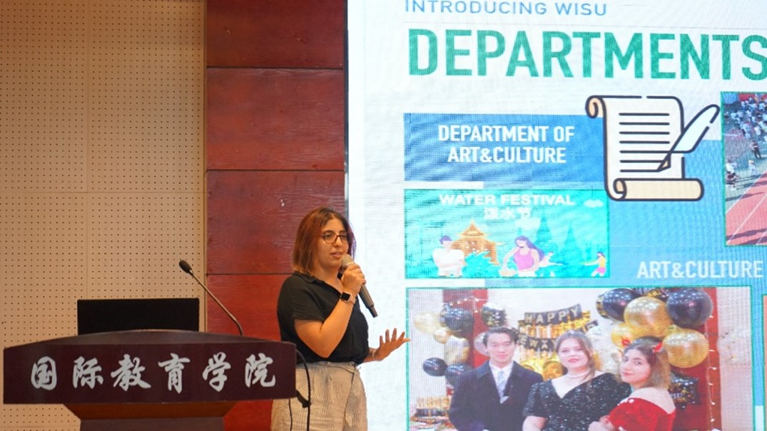 Jasmine, President of the Wuhan University International Students Union (WISU), gave a presentation on the setup, responsibilities and activities of WISU. WISU is dedicated to helping international students to solve various problems they encounter in their studies and lives, and organizing a colorful series of activities. She called on new students to actively join WISU and dedicate their own strengths to it.