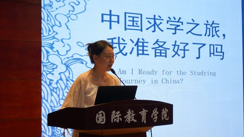 Zhou Cuiyun, deputy secretary of the Party committee and deputy dean of the school, introduced the history and conditions of the university, as well as its rules and regulations, to international students. She introduced the history of the university and the School of International Education, the campus environment and the rich campus life, to help new students better understand the university and the school. She also introduced the relevant management regulations of the university and the school, and gave safety tips to students based on certain key areas, warning them of things that happen around them. She hoped that all the students would have a safe, fulfilling and enjoyable campus life.