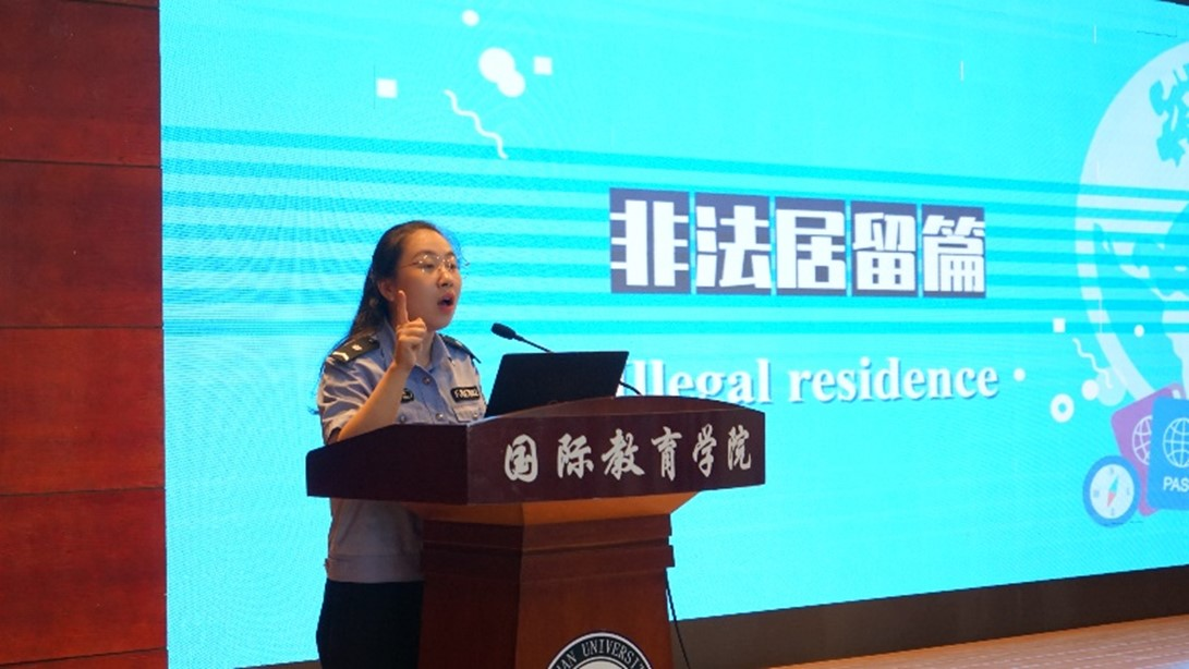 Officer Liu Xinyang of the Exit-Entry Administration Bureau of the Wuhan Municipal Public Security Bureau gave a lecture on laws and regulations. Officer Liu introduced the Law of the People's Republic of China on the Control of Exit and Entry and related laws and regulations to international students using videos and case studies, reminding them to abide by Chinese laws and regulations, be wary of illegal residence and employment, and watch out for scams.
