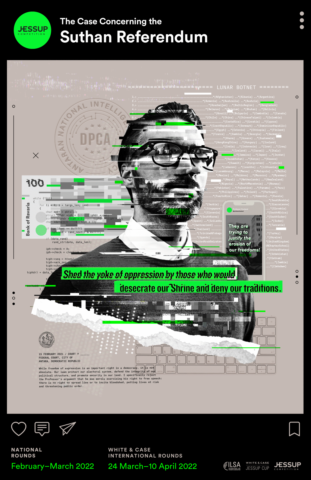 The problems of this year's Jessup competition are set against the background of a referendum and cover a variety of topics such as admissibility of evidence, disinformation, foreign-financed interference in elections, freedom of expression in cyberspace, and extraterritorial enforcement in cyberspace.