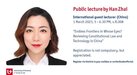 As a guest lecturer, Dr. Zhai Han participated in two master's courses and one undergraduate course at the University of Antwerp Faculty of Law on the constitutionalisation of national security in contemporary China, the legal protection of women's rights in socialism and the unitary system as a constitutional feature in China, teaching over 250 students. In addition, as a result of her appointment, Dr. Zhai Han gave a public lecture at the University of Antwerp on the development of technology in contemporary China and a review of the impact of legal scholarship on the current state of technological legislation, focusing on the legal framework underlying the governance of cyberspace in China and discussing two cases of local government data opening and personal information protection.