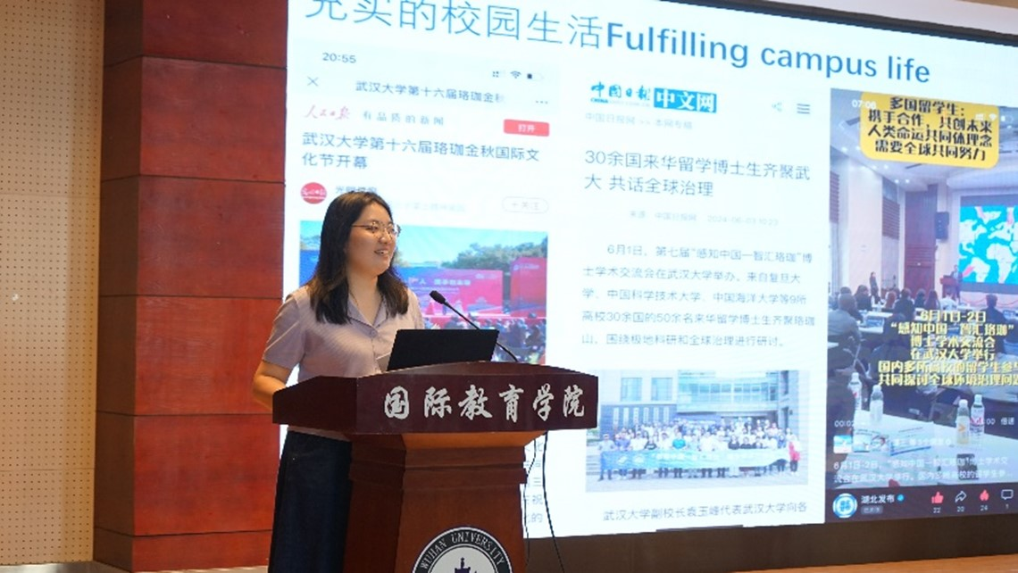 Jasmine, President of the Wuhan University International Students Union (WISU), gave a presentation on the setup, responsibilities and activities of WISU. WISU is dedicated to helping international students to solve various problems they encounter in their studies and lives, and organizing a colorful series of activities. She called on new students to actively join WISU and dedicate their own strengths to it.